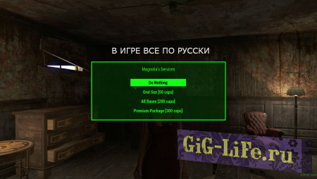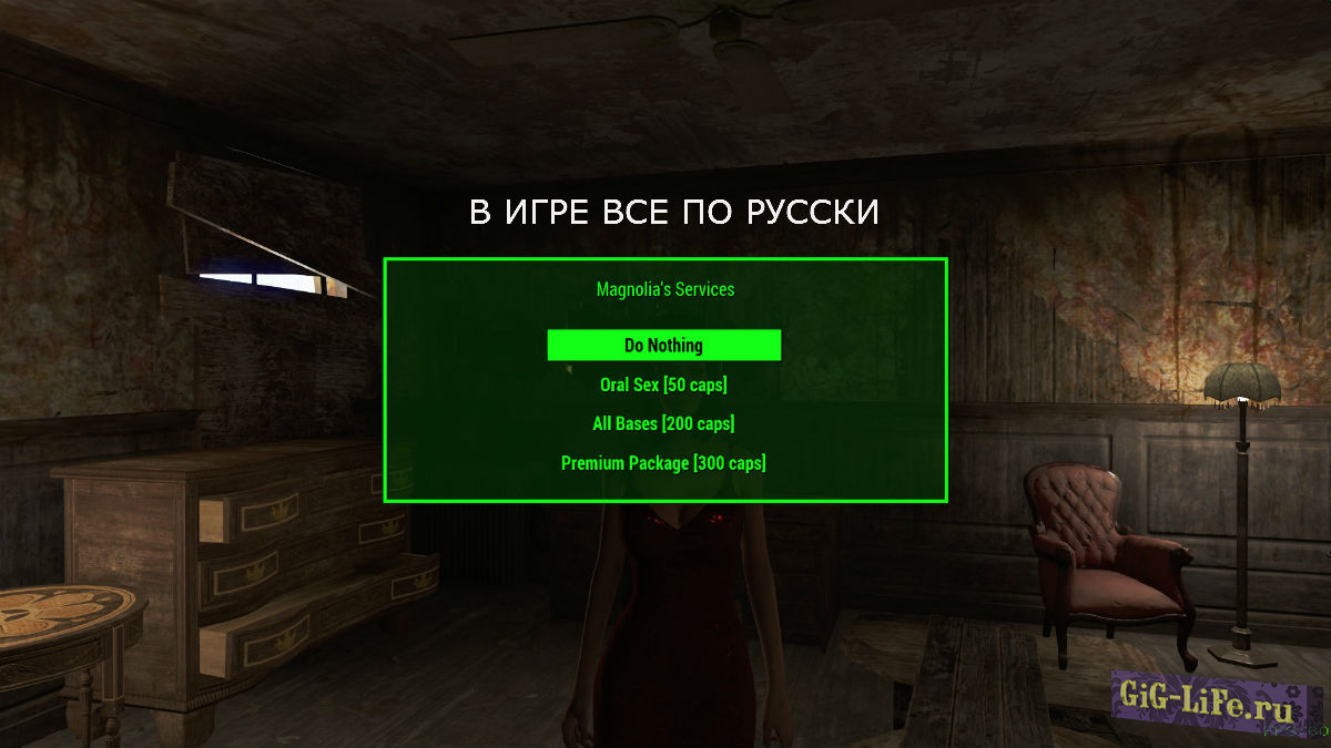 - Совершенно очевидно, что оригинальное предназначение Магнолии в игре, быть единственным NPC, с которой вы можете заниматься любовью, не будучи компаньонкой. Этот мод теперь восстанавливает ее потенциально задуманное предназначение, как проститутку и когда вы уединяетесь в ее комнате, вы теперь можете выбрать ее услуги в обмен на крышки. Вся эта функция является необязательной и может быть включена / отключена с помощью настроек голодиска.