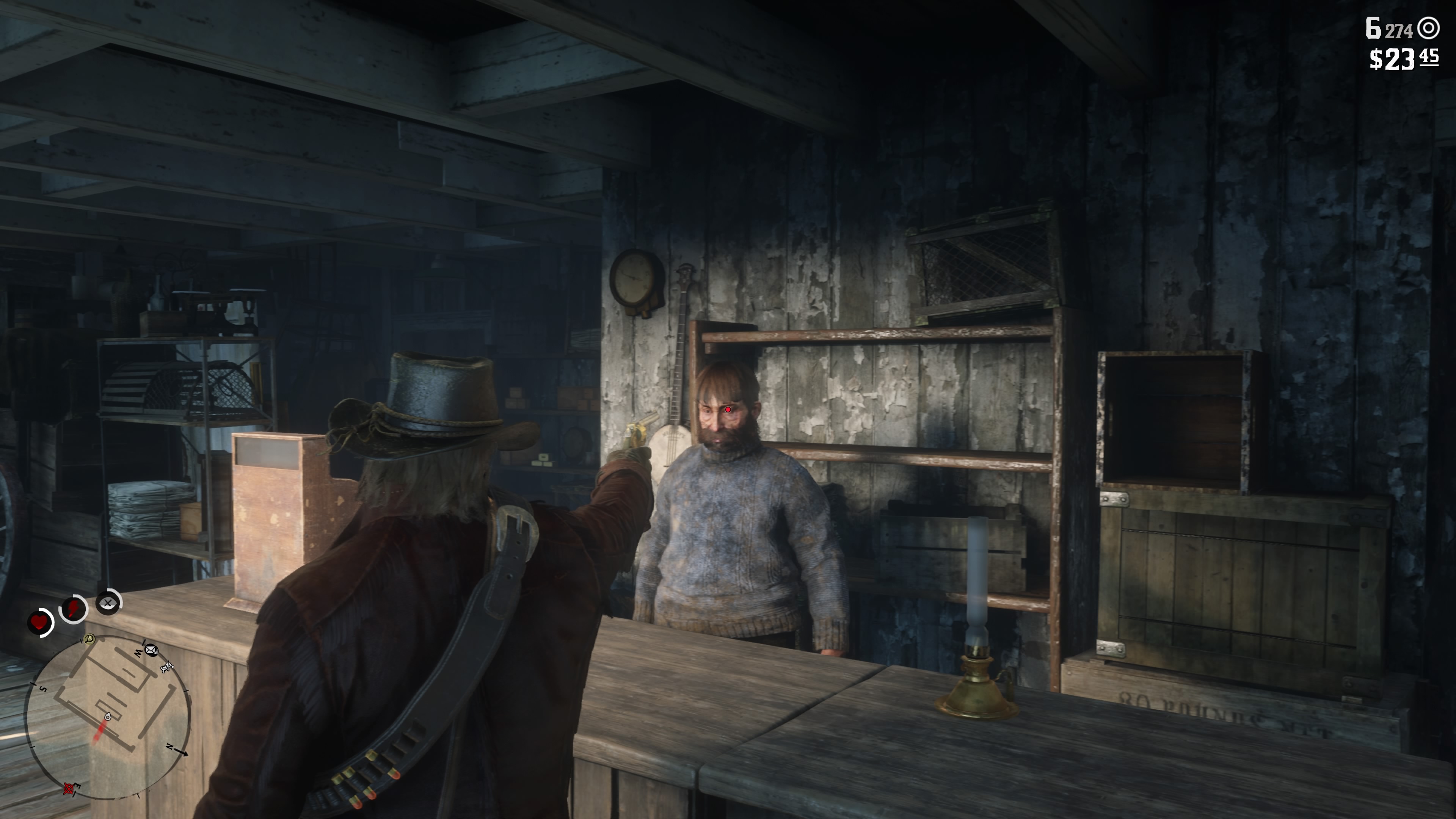 В магазинах, как правило, есть еще много ценных вещей, которые вы можете взять с собой помимо денег. Когда возьмите все необходимое, быстро выбегайте на улицу, позовите свою лошадь и уезжайте прочь. В некоторых случаях вас может заметить случайный человек, который побежит рассказывать о случившемся шерифу. В этом случае он будет помечен на карте в виде красного глаза. Старайтесь догнать стукача и хорошенько надрать ему задницу.