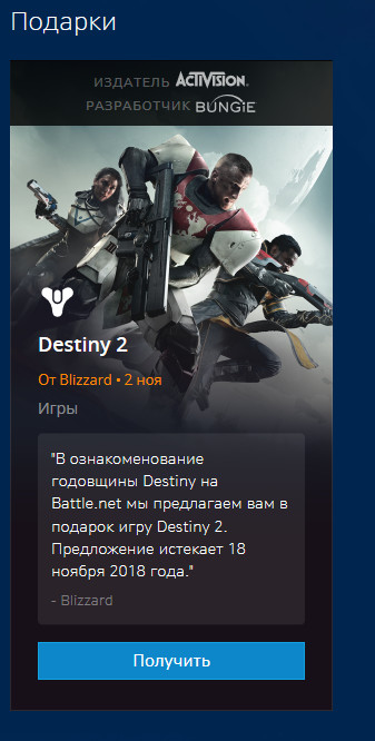 Компания Blizzard объявила о том, что геймеры могут забрать Destiny 2 в ограниченный срок абсолютно бесплатно.Для активации необходимо зайти в меню подарков в Battle.net.Предложение доступно до 18 ноября. Destiny 2, Blizzard, Халява, Battle.net Facebook Twitter Мой мир Вконтакте Одноклассники Google+ Телеграм