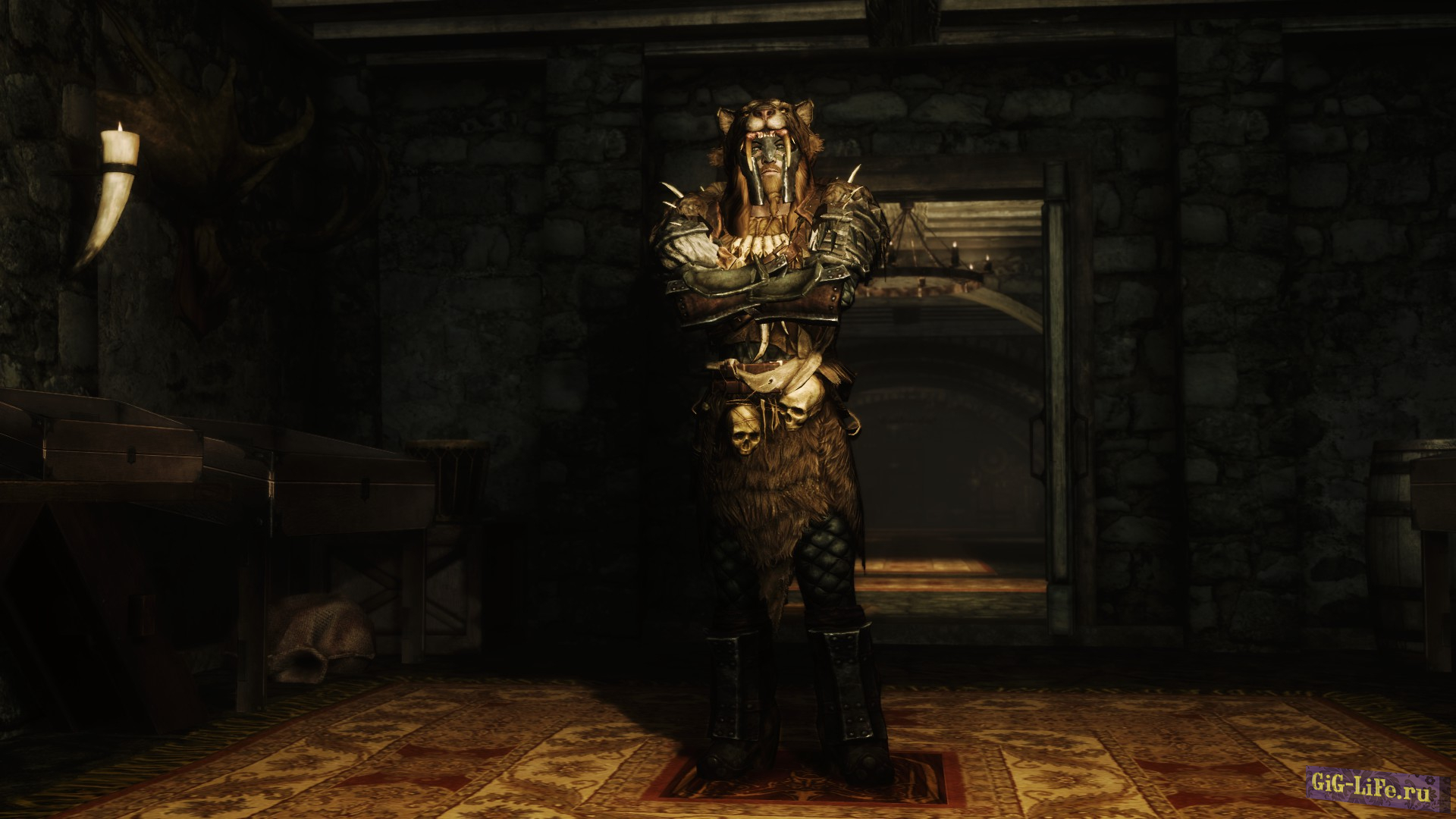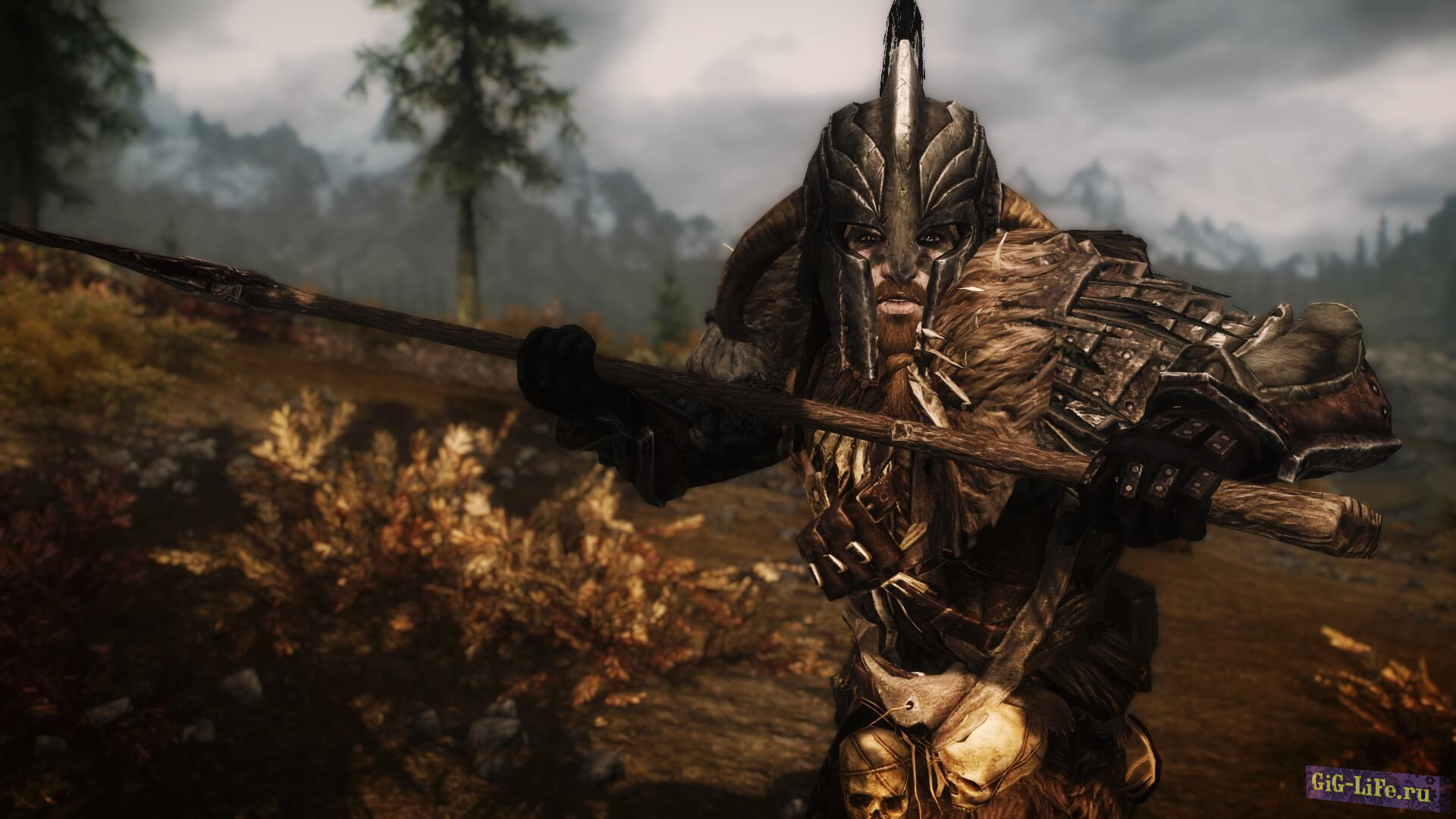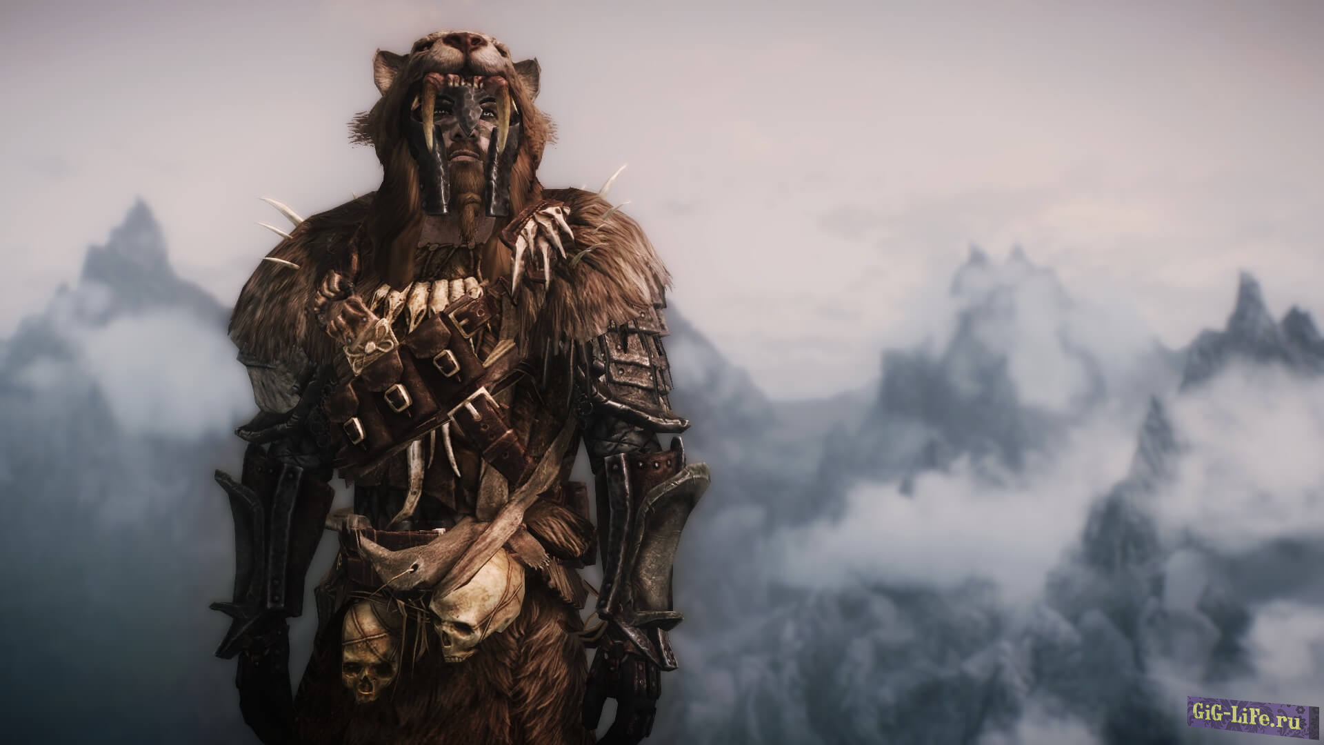 Броня имеет высокое внимание к деталям и покрыта варварским тематическим орнаментом, таким как черепа, кинжал, мешочек для монет, различные другие сумки/кости и т. д. Обратите внимание, что есть два варианта шлема: один очень бронированный, а второй похож на саблезубую кошачью шкуру с подложкой. Короче говоря — броня, достойная вождей!