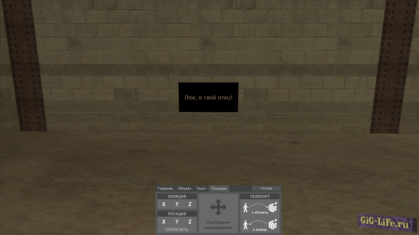 В это вкладке можно изменить позицию или ротацию объекта, телепортироваться к объекту или объект к себе, а так же режим свободного перемещения.