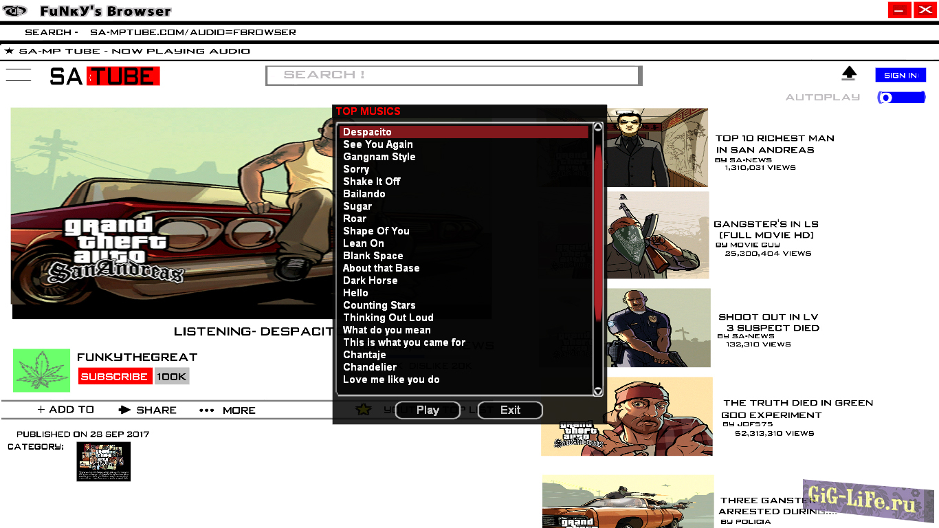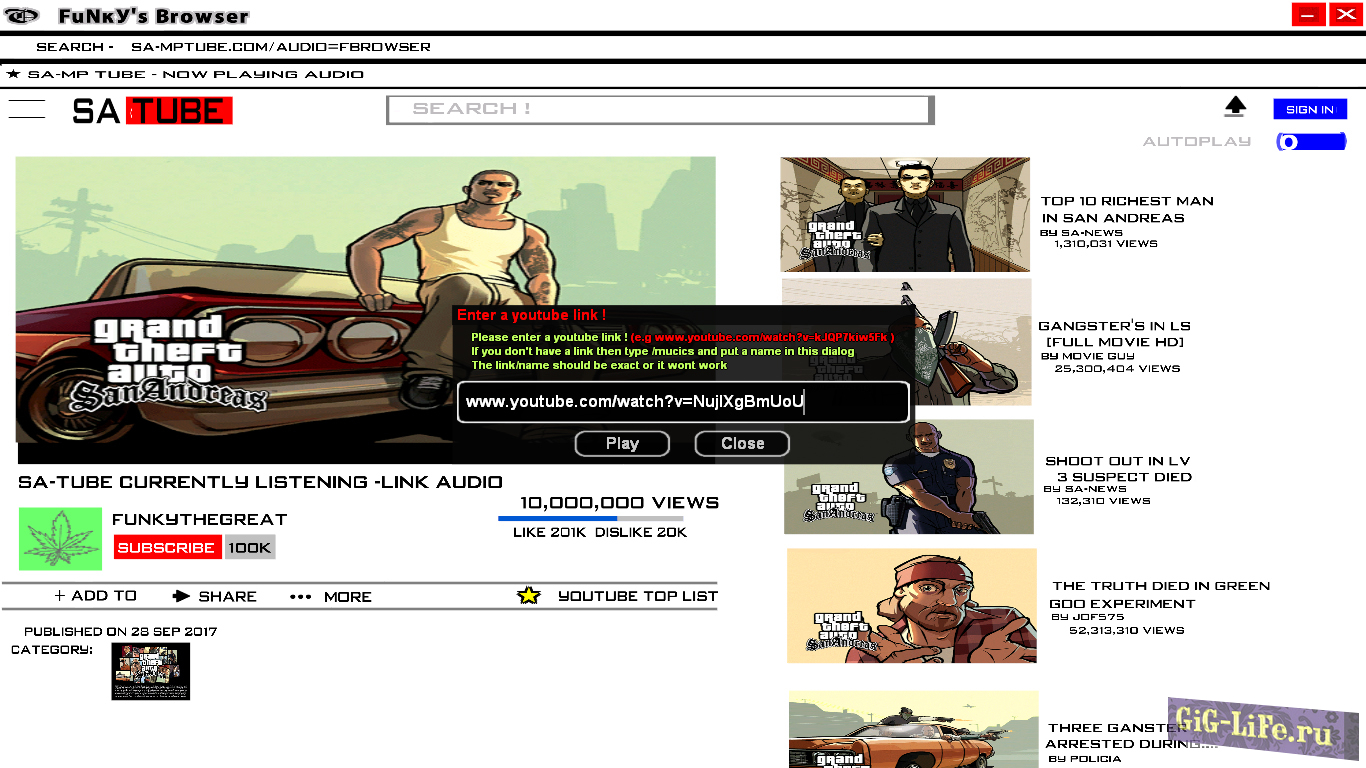 Данный фильтерскрипт добавит аудиоплеер в виде Ютуб страницы на сервера sa-mp