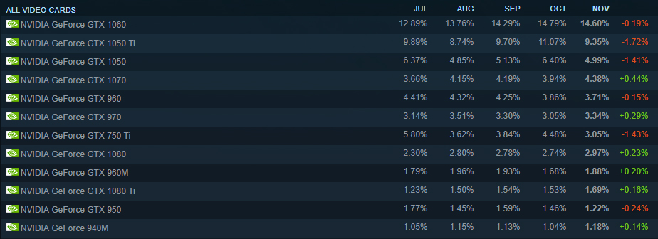 ноября наблюдался постоянный рост пользователей с этими моделями видеокарт, но теперь их популярность снизилась, хотя они по-прежнему входят в ТОП 3.