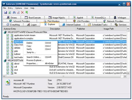 Для опытных пользователей, предпочитающих инструменты посерьезнее, Марк Руссинович и Брюс Когсвелл разработали бесплатную утилиту Autoruns. Она не требует установки и позволяет извлечь подробные сведения обо всех автоматически стартующих программах, драйверах, сервисах, сетевых приложениях, библиотеках, компонентах Internet Explorer и т.д. Для удобства анализа информации все системные модули разделены по категориям и разнесены по отдельным вкладкам. Для отключения автоматом загружающихся программ достаточно снять соответствующую галочку или, проследовав через меню Jump to в указанную ветку реестра, подправить ее самостоятельно. В отличие от аналогов, Autoruns предоставляет дополнительную информацию о любом из процессов или системных сервисов всего одним нажатием кнопки: запрос будет отправлен на поисковый ресурс Microsoft Live Search, а найденные результаты отобразятся в браузере. Также в комплекте поставки имеется версия утилиты, работающая из командной строки. Autoruns - очень мощный инструмент, и во избежание неприятных ситуаций пользоваться им нужно предельно аккуратно.