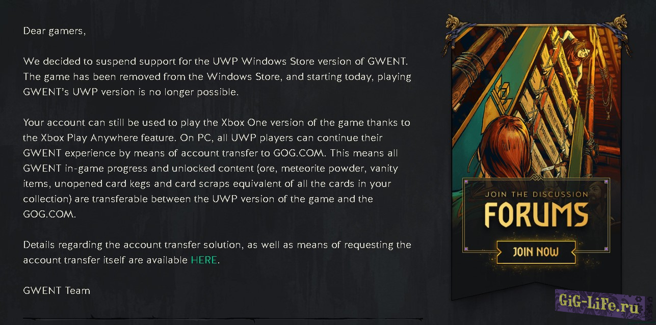 Теперь к серверам «Гвинта» через версию из Microsoft Store подключиться невозможно. Игра вновь стала эксклюзивом для GOG, а всем фанатам предложили перенести свой прогресс на GOG-аккаунт.Увы, перенос работает далеко не для всех.