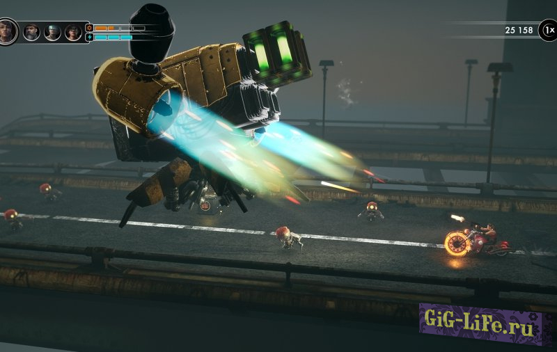 Присоединитесь к Стальным Крысам - банде байкеров, поклявшейся защищать свой город от инопланетных мусороботов. Крушите толпы врагов, переключаясь между четырьмя уникальными персонажами на сверхмощных мотоциклах, оснащенных циркулярными пилами.