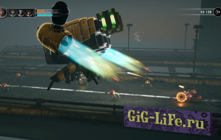 Мотоцикл - ваше главное оружие в бою с ордой инопланетных захватчиков-мусороботов. Сочетайте ожесточенный рукопашный бой, точную прицельную стрельбу и впечатляющий арсенал своего железного коня, в который входят циркулярные пилы на колесах, гарпунные ружья и пламя из выхлопных труб. Уверены, вы найдете множество оригинальных способов расправляться с врагами. Катайтесь стильно! Заведите мотор и научитесь использовать реалистичную физическую модель для совершения зрелищных трюков и мастерского истребления мусороботов. Чем оригинальней - тем лучше!
