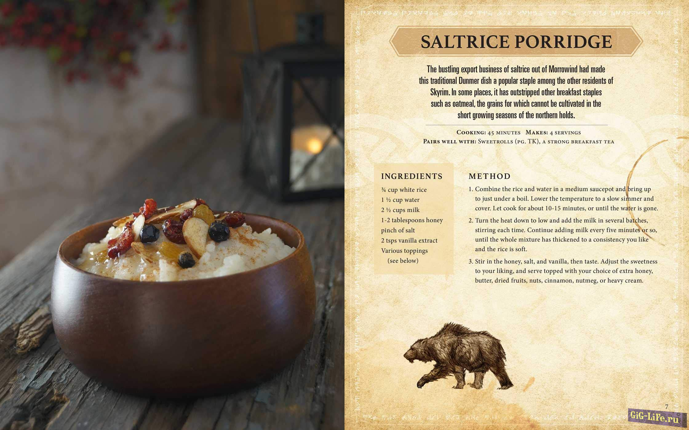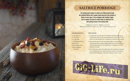 Согласно описанию на Amazon, официальная книга рецептов научит готовить кулинарные шедевры из TES: Skyrim, TES: Morrowind и других. В неё будет включено более 60 блюд со всего Тамриэля, позволяя познакомиться с кухнями нордов, босмеров, каджитов и многих других рас. Авторы обещают появление рецептов супа из капусты и яблок, сладкого рулета и многих других популярных угощений.