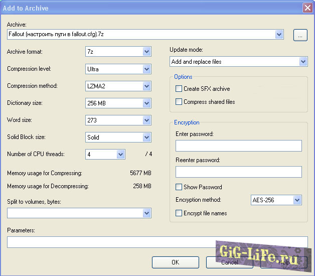 - dictionary size: чем больше - тем лучше. Можно считать его ключевым параметром после compression level. Так как объем оперативной памяти у меня всего 8 гигабайт - пришлось ограничиться значением 273. Обратите внимание, что объем памяти для декомпрессии невелик. И если вы счастливый обладатель 32 гигабайт оперативной памяти - вы можете достигнуть максимального значения; при этом не беспокоясь, что кто-то ваш архив распаковать не сможет;