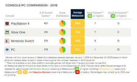 Общее количество оцененных в 2018 году игр. Положительная оценка — от 75 баллов, смешанная оценка — от 50 и до 74, а негативная оценка — до 49 баллов. Средняя оценка всех игр для каждой платформы — не ниже 70 баллов: