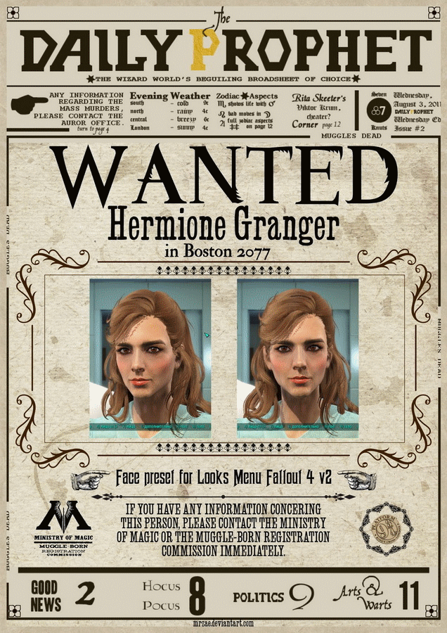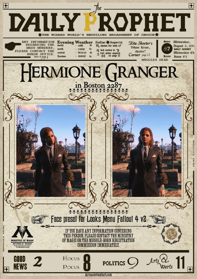 ↑AA↓ Распечатать Гермиона Грейнджер в Бостоне 2077 / Hermione Granger in Boston 2077 Плагин для Fallout 4 добавляет пресет лица Гермионы Грейнджер.Требования:F4SEHair - MiscHairstyle 1.6Eye textures - ScarlettУстановка:Стандартная Полезное: Инструкция по установке/удалению мода Настройка FALLOUT4.INI Консольные команды Fallout 4, Гермиона Грейндж, Модификация mrzae" /> Facebook Twitter Мой мир Вконтакте Одноклассники Google+ Телеграм
