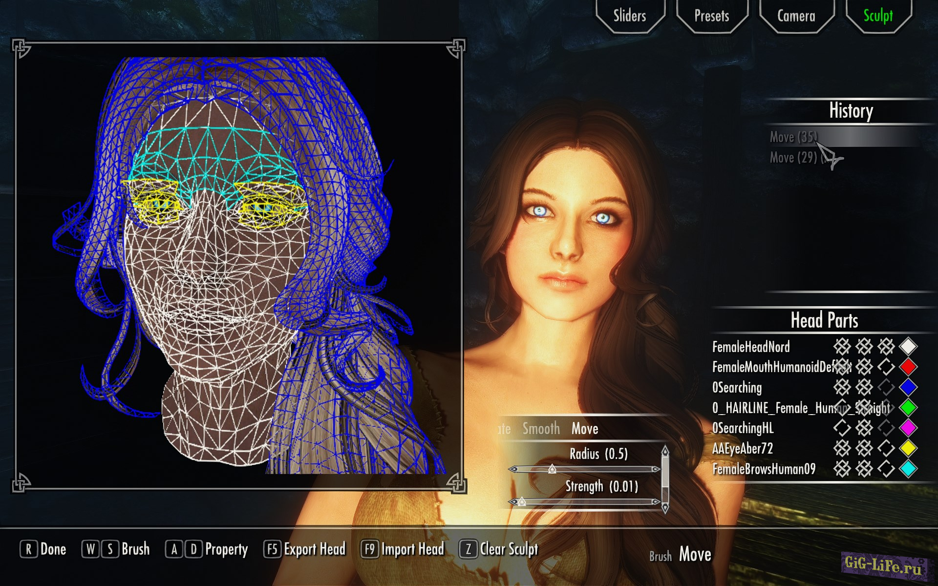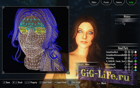 "Части головы" - Это окошко для предварительного просмотра изменений каркаса, в том числе недоступные для изменений meshes (поэтому они не могут быть отредактированы), что делает meshes видимыми или изменяет цвет каркаса