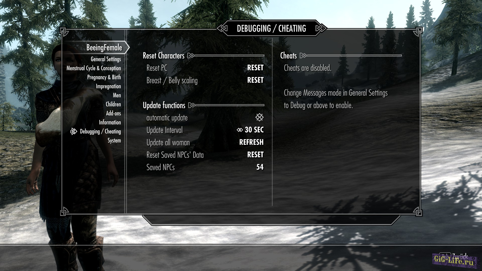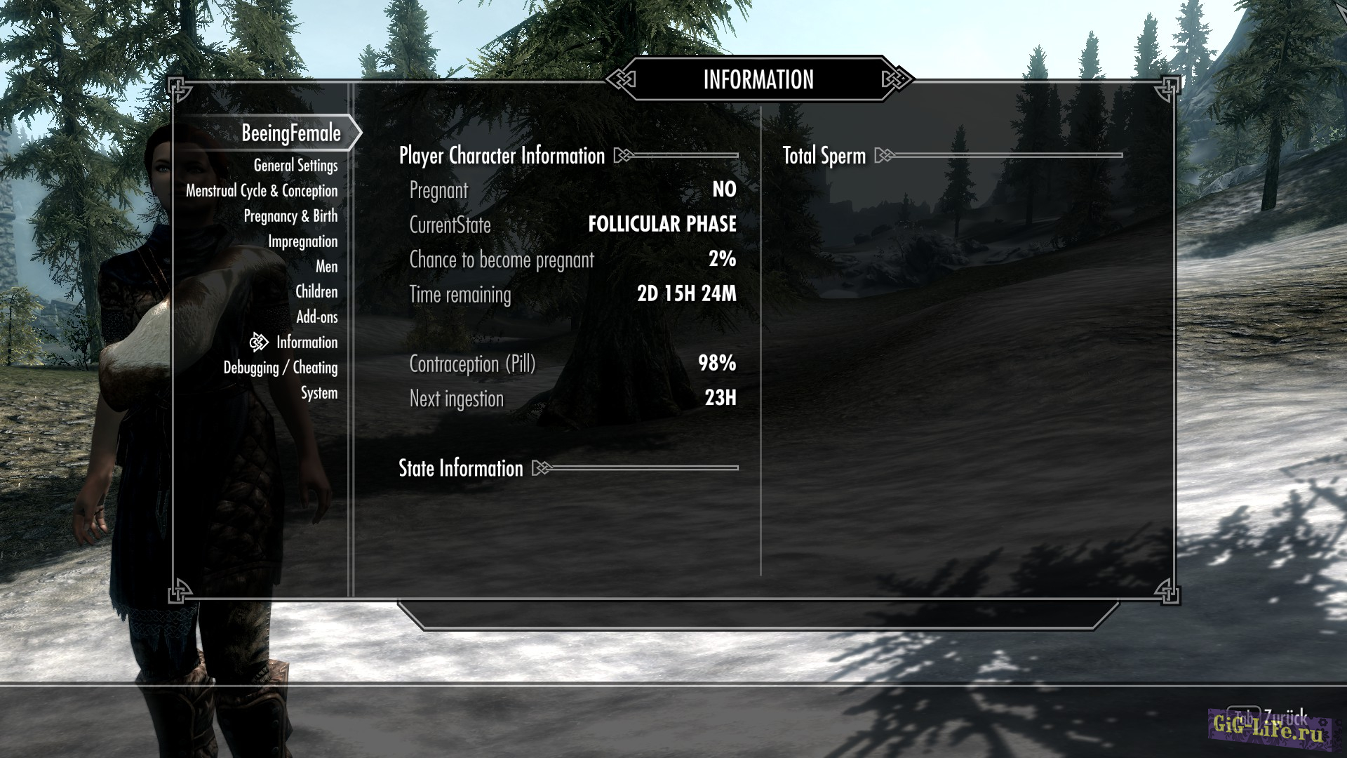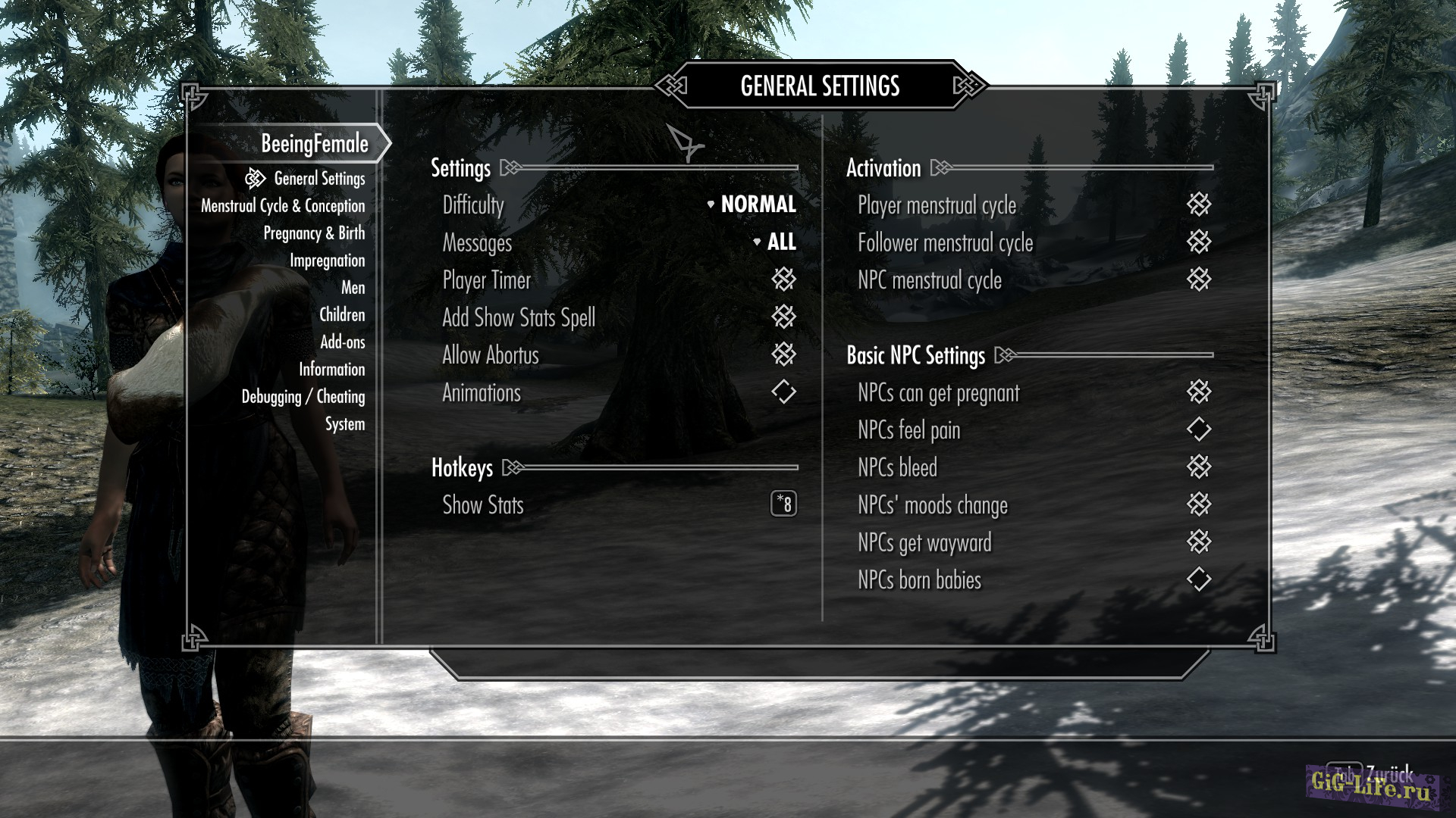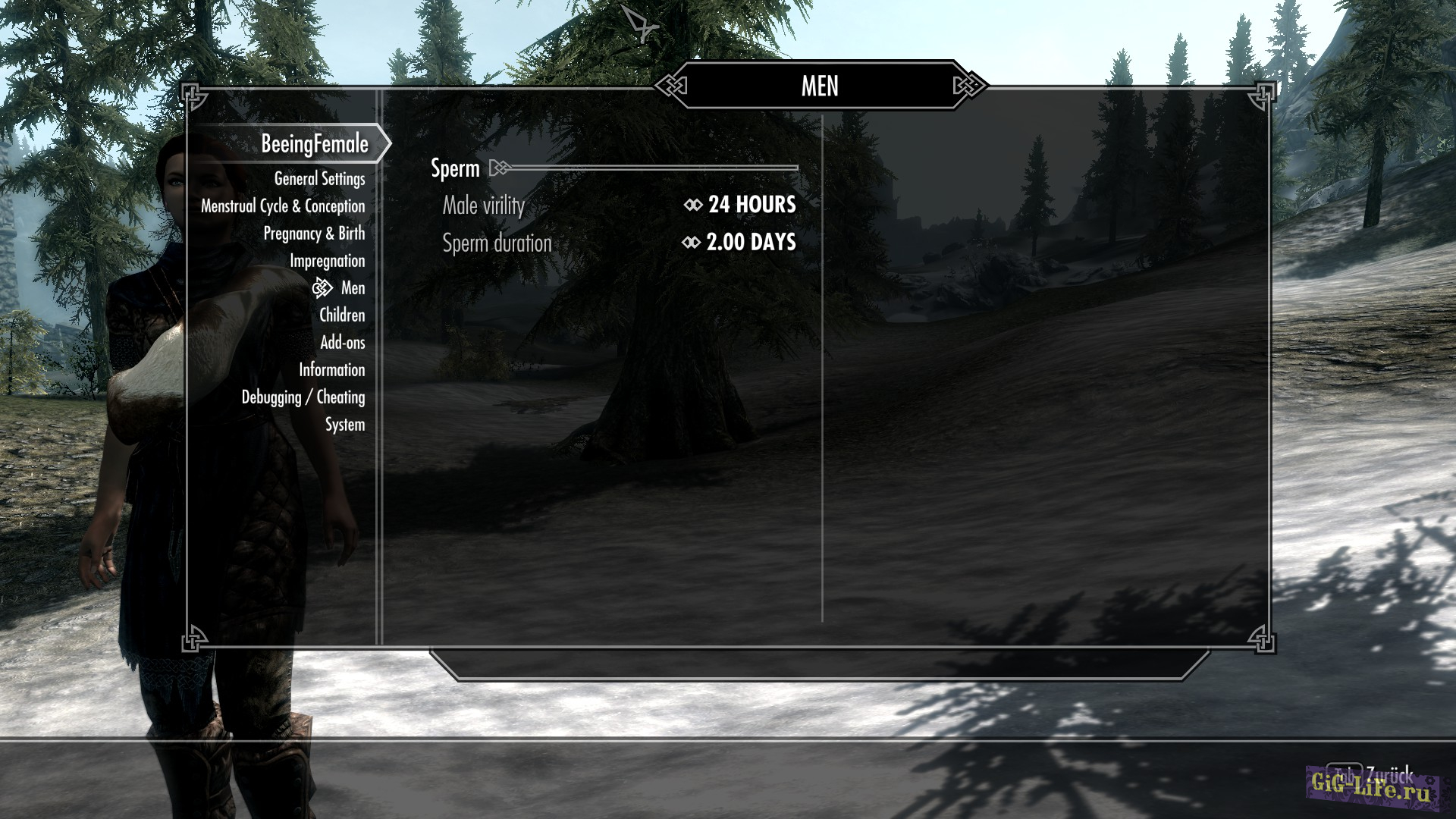 Изначально BeeingFemale был простым модом, добавляющим в игру симуляцию цикла менструации и беременности для женских персонажей и NPC. Однако теперь он разросся в полноценный аддон. Это огромный, динамичный и реалистичный мод, добавляющий множество новых функций. Он добавляет в Skyrim новые элементы геймплея, отвечая на вопрос — откуда в игре взялись дети.