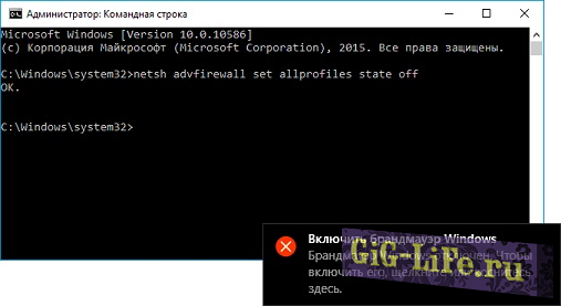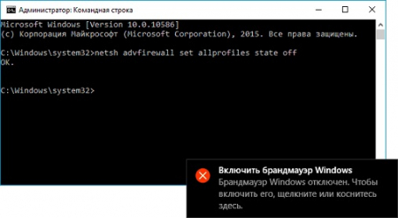 netsh advfirewall set allprofiles state offА затем просто клацнуть на Enter. В итоге под введенной строкой появится надпись «ОК», а сам инструмент будет отключен.