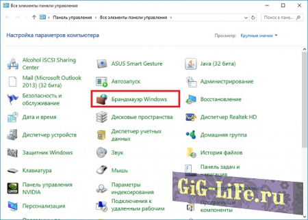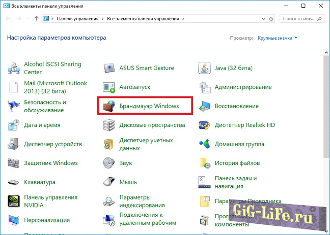 После этого будет открыта новая Панель управления. Здесь необходимо раскрыть все элементы, а затем отыскать там Брандмауэр Windows.