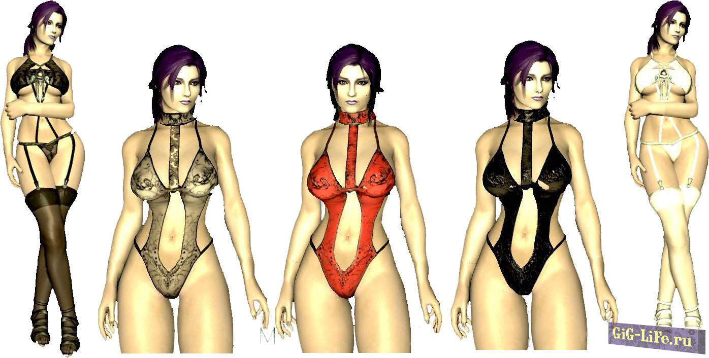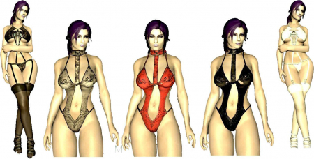 Девять вариантов сексуального женского белья. Некоторые комплекты включают чулки, каблуки, топики, бодики, подвязки, трусики и все в таком духе. Вся эта одежда (ткань) не дает брони, но её можно зачаровать.