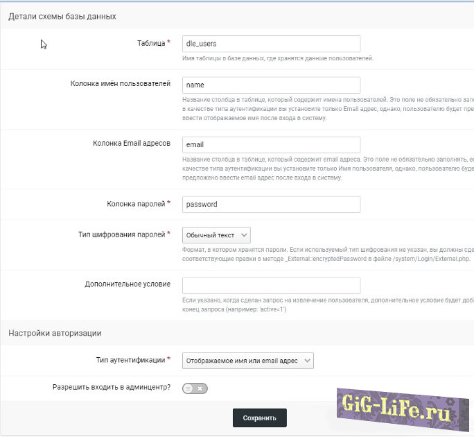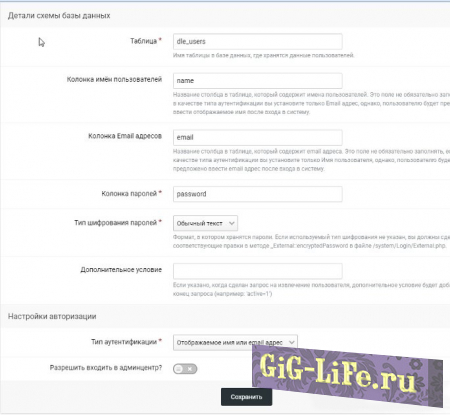 - Тип шифрования паролей: Если у вас версия DLE 11.1 и меньше - берём значение MD5, если больше - Обычный текст