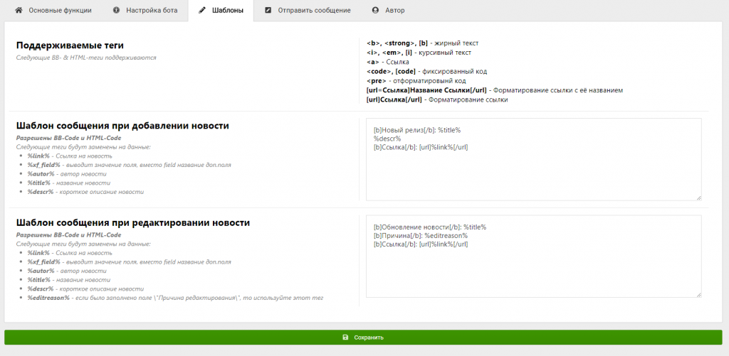 Модуль позволяет отправлять сообщения в выбранный чат при помощи бота. Гибкие настройки позволят модулю отправлять лишь то, что вы хотите.