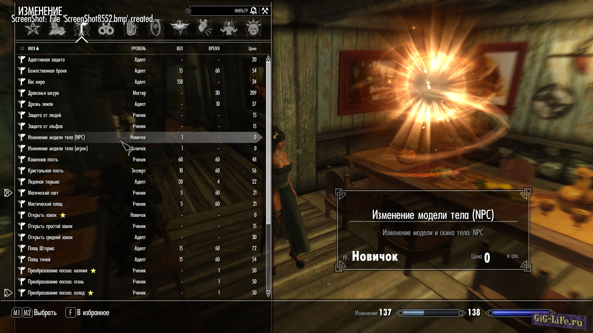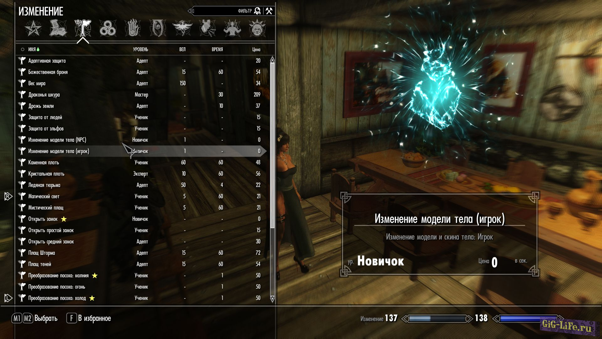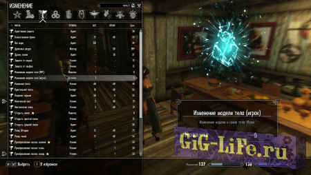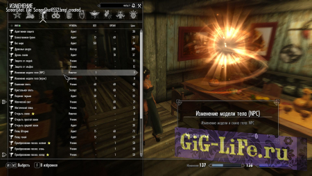 - В ваш список магии в раздел магии Изменения добавится 2 заклинания, которые позволят изменять тело и скин у NPC женского пола и вашего персонажа. Заклинание изменения NPC применяется направленно на любого дружественного или нейтрального NPC женского пола. Заклинание изменения игрока применяется автоматически на игрока, подобно каменной плоти. После каста любого из этих 2-х заклинаний появится контексное меню, где можно изменить тело и скин. А также вернуть исходные настройки.