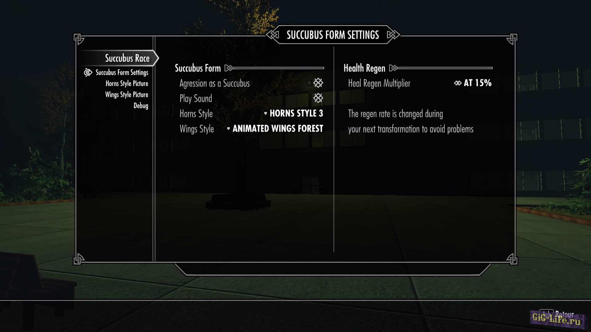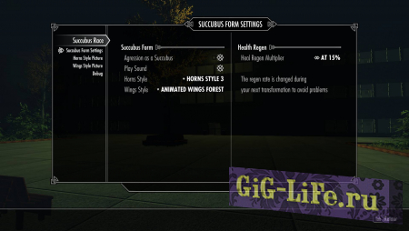 МСМ меню позволит настроить вид крыльев для суккуба. Четыре анимированных пары и три статичных пары крыльев. Также есть выбор между пятью типов рогов или вообще без них.