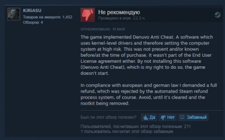 В игре появился античит Denuvo. Программа, которая использует драйвер уровня ОС и делает компьютер уязвимым. Об этом не было известно, когда я приобретал игру. Об этом не было указано в Лицензионном соглашении тоже. Не устанавливая эту программу, на что у меня есть право, игра не запускается.