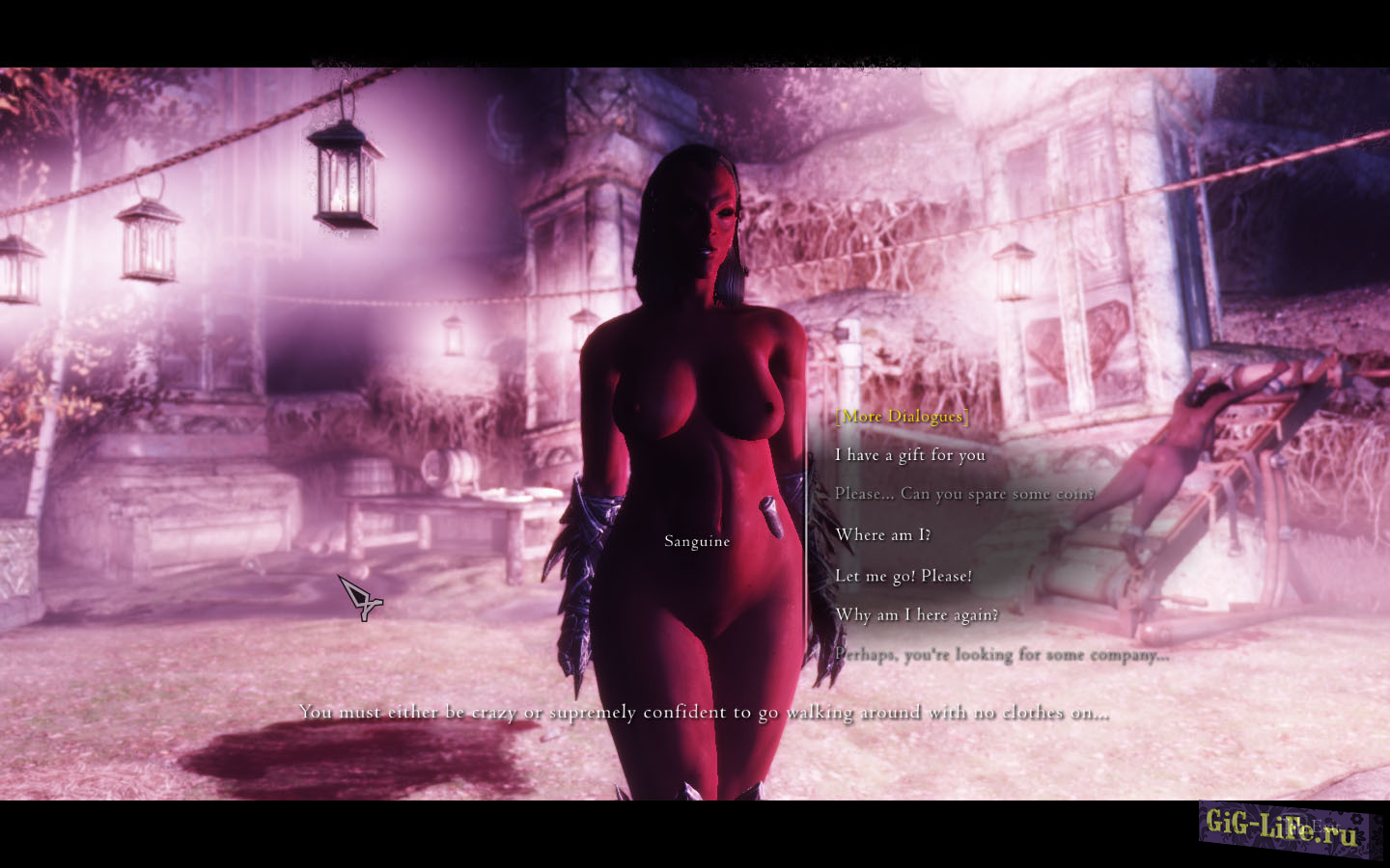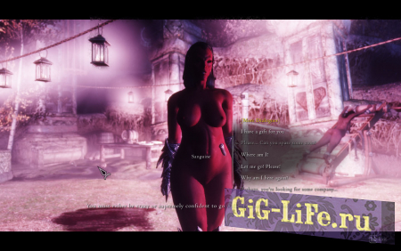 Sanguine's Debauchery - это мод, который подвергает игрока порабощению в качестве альтернативы смерти. Будучи порабощенным противниками, которые поражают игрока в бою, игрок получает интересные сюжетные линии и, прежде всего, непрерывный рассказ вместо смерти и экрана перезагрузки.