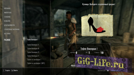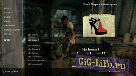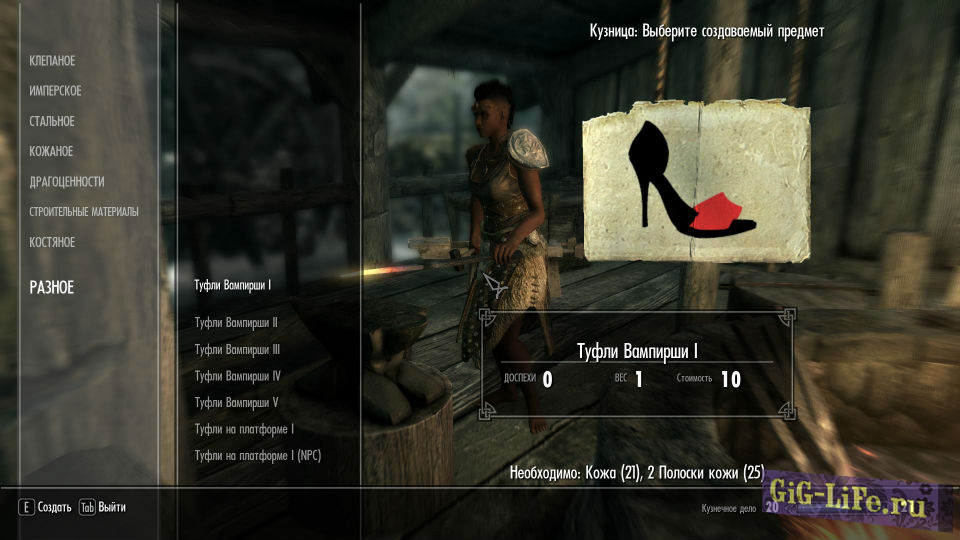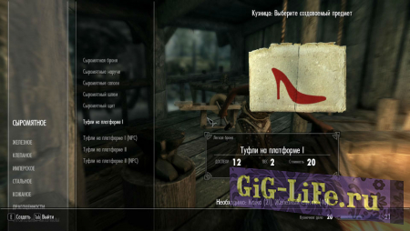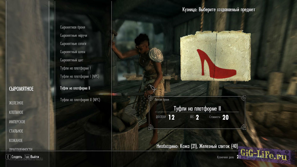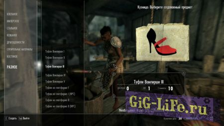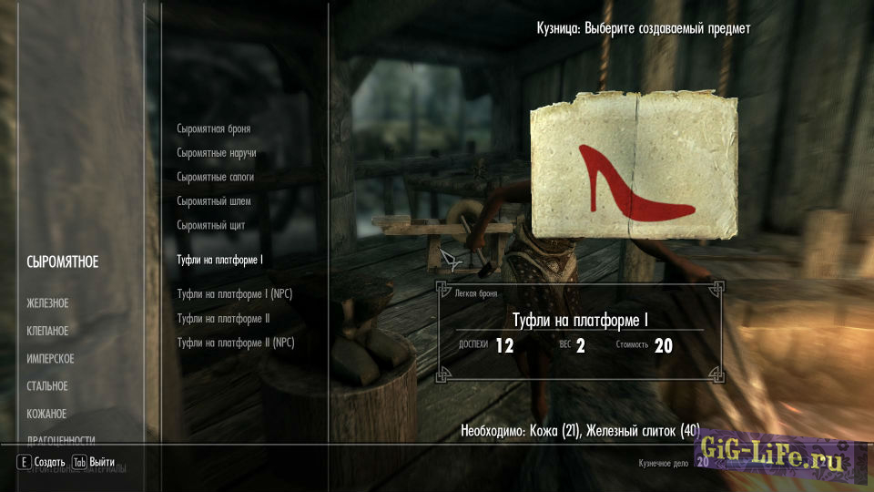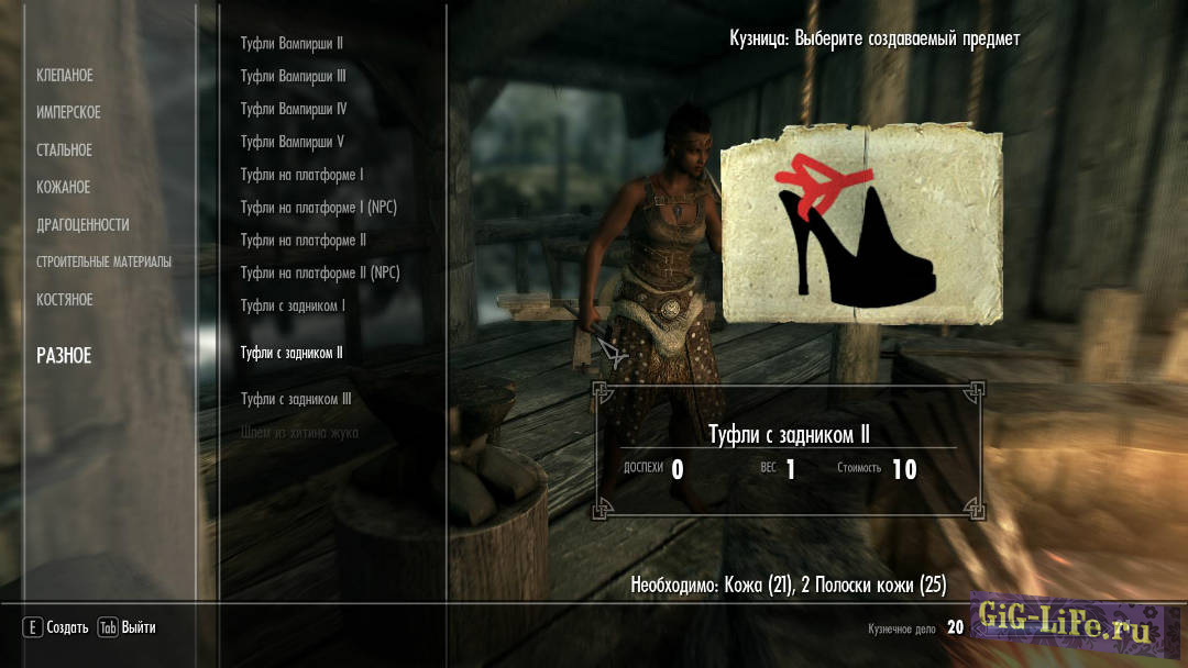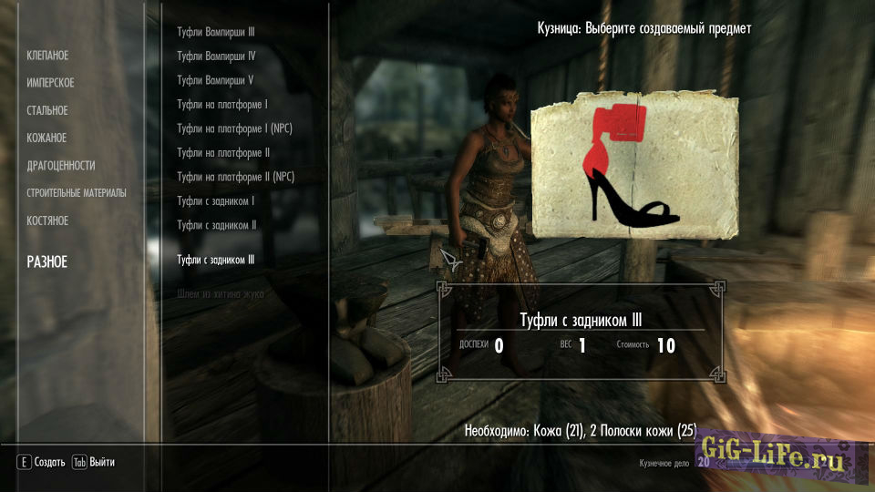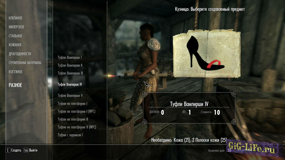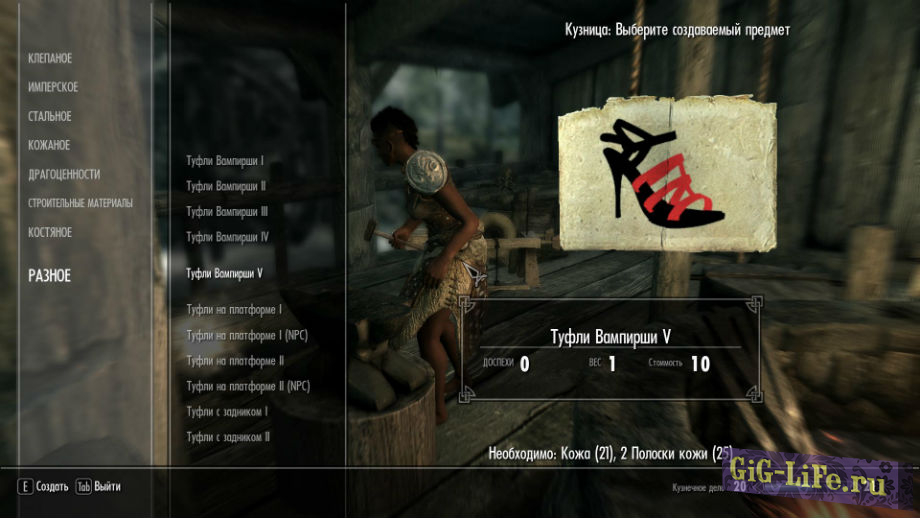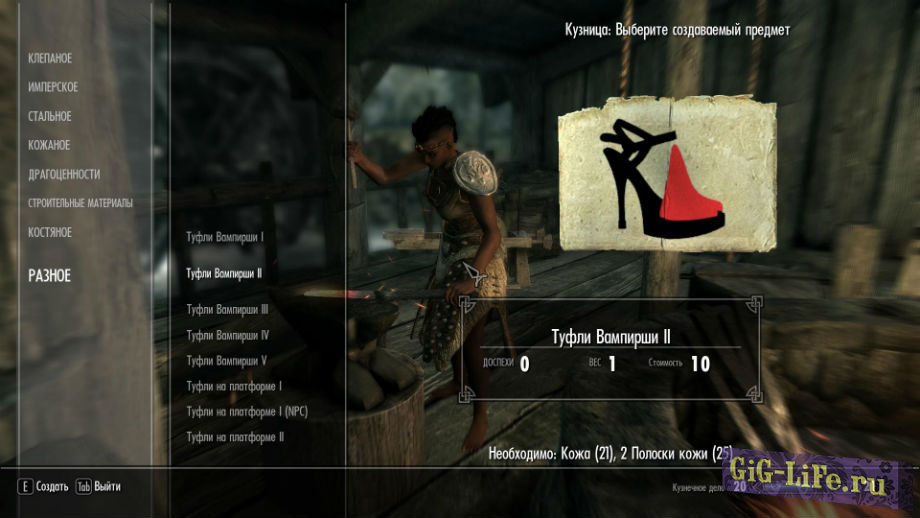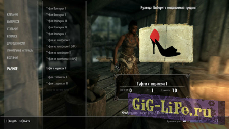 - Туфли можно изготовить в кузнице, в разделах Разное/Сыромятное/Железное (перки не требуются)