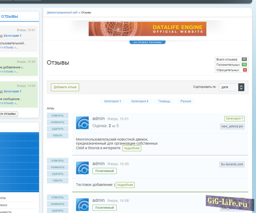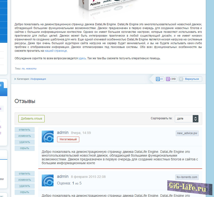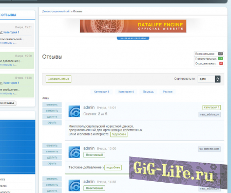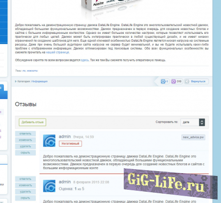 Это расширенная версия модуля для реализации отзывов на движке DataLifeEngine. Его можно использовать в качестве отзывов для проектов магазинов, личных портфолио и много другого. Без каких либо доработок можно использовать как модуль рецензий для киносайтов, сайтов с сериалами, аниме и т.п.