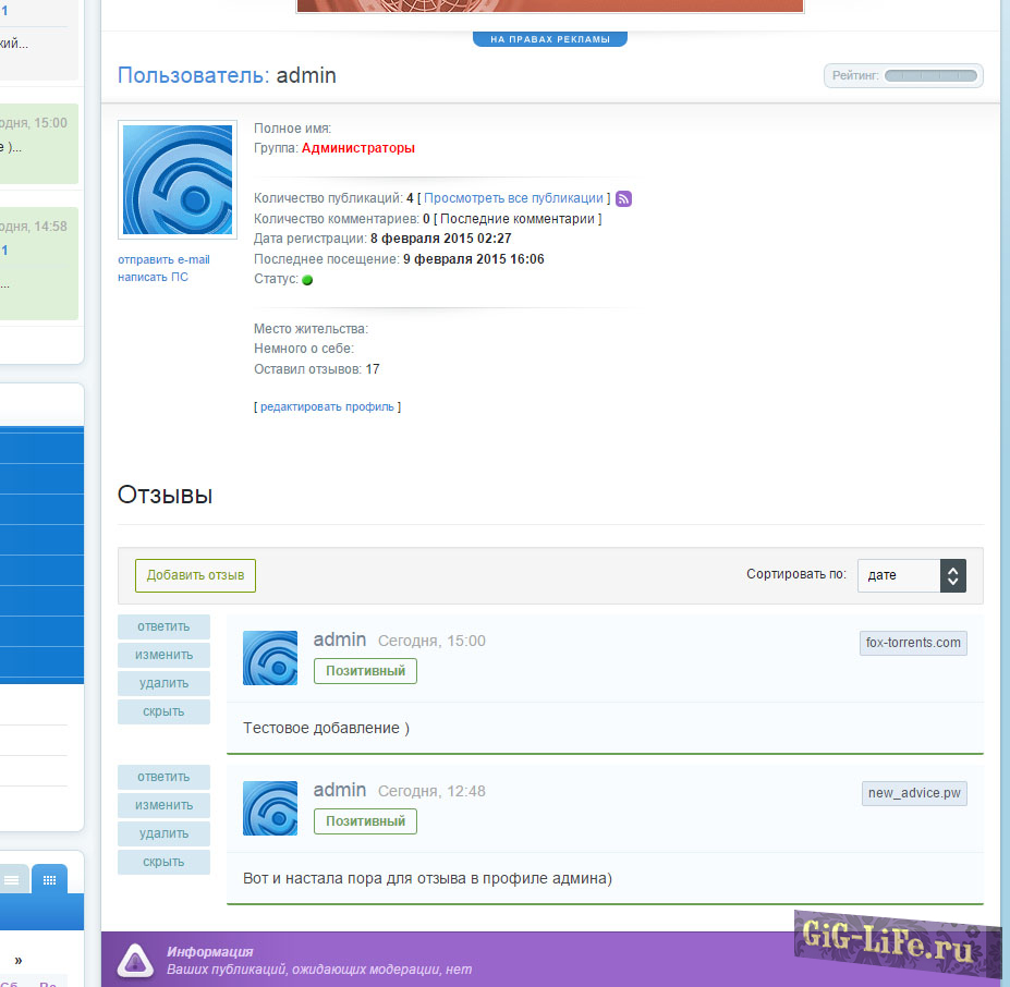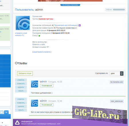 - Запрет добавления отзывов у пользователя (индивидуально)