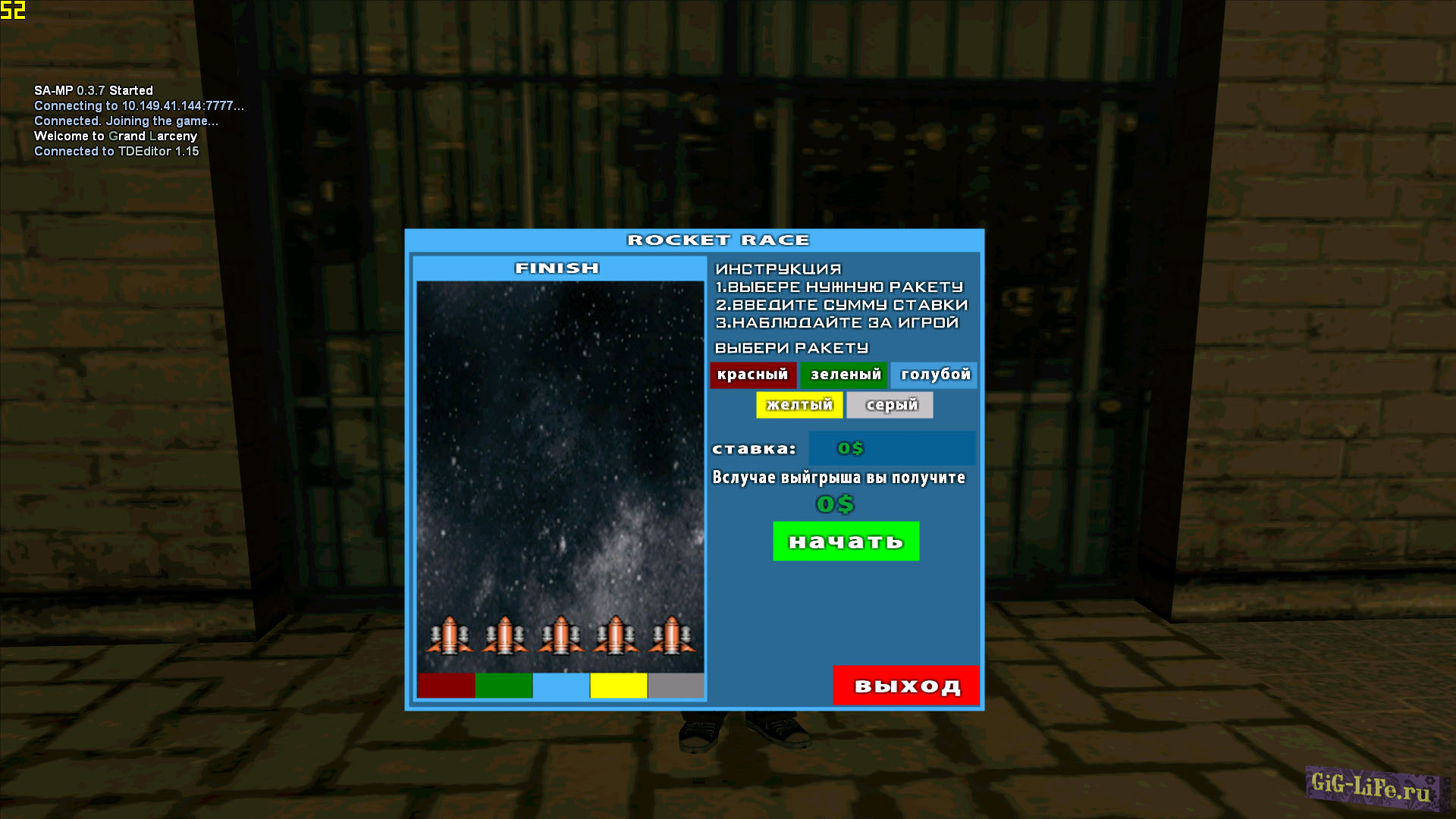Данный скрипт представляет из себя игру в стиле "гонка ракет" (возможно, кто-то в одиночной игре замечал подобную игру с лошадьми, на которых можно было делать ставки). С помощью окна на текстдравах, вы сможете выбрать цвет ракеты, на которую вы сделаете ставку и саму сумму ставки. При победе вы получите в два раза больше денег, чем ставили.