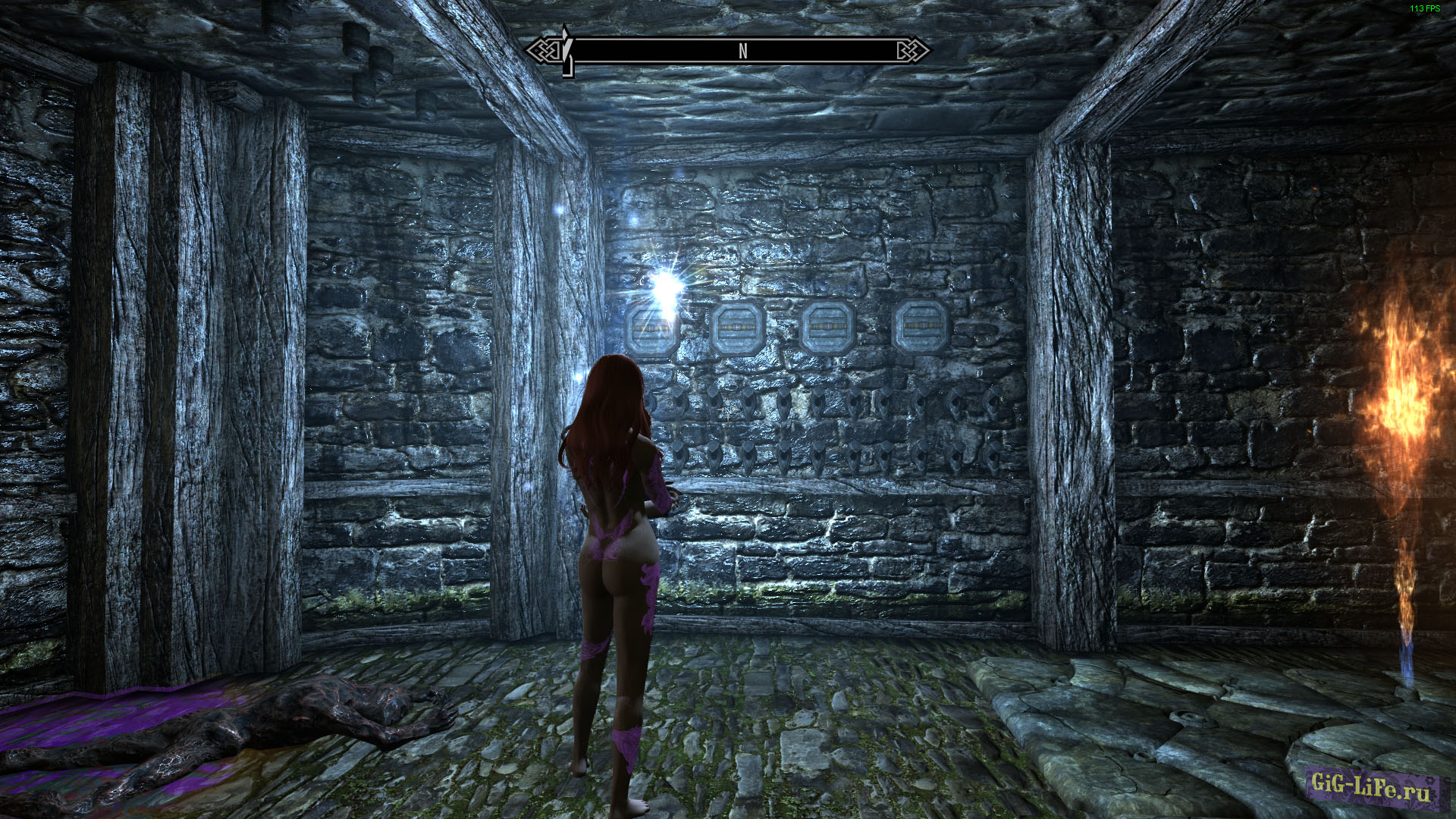 Сбежавший труп заключенного, под огненными ловушками, содержит предметы для борьбы.