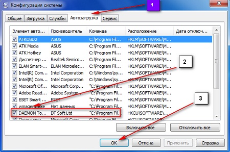 Шаг второй – находим и убираем (необходимо убрать галочку) неиспользуемые при старте программы с автозагрузки. Например, у меня это DAEMON-Tools. Жмем Ок.