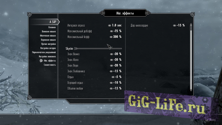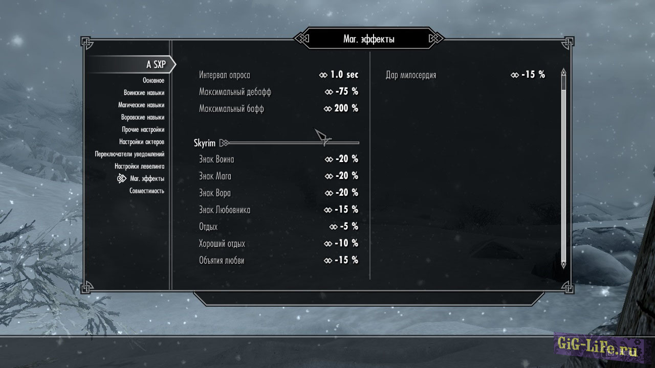 Вкладка «Магические эффекты»: настройте числовые значения положительных и отрицательных маг. эффектов, которые могут повлиять на получение опыта. Под эти настройки могут попадать эффекты из: Skyrim, USLEEP, Realistic Needs and Diseases, iNeed и Herbal Tea.