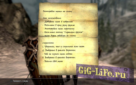 Автоматическое убирание, всех стандартных щитов за спину. Работает для персонажа и спутника. Модификация позволяет носить щит с двумя мечами, и двуручным оружием одновременно.