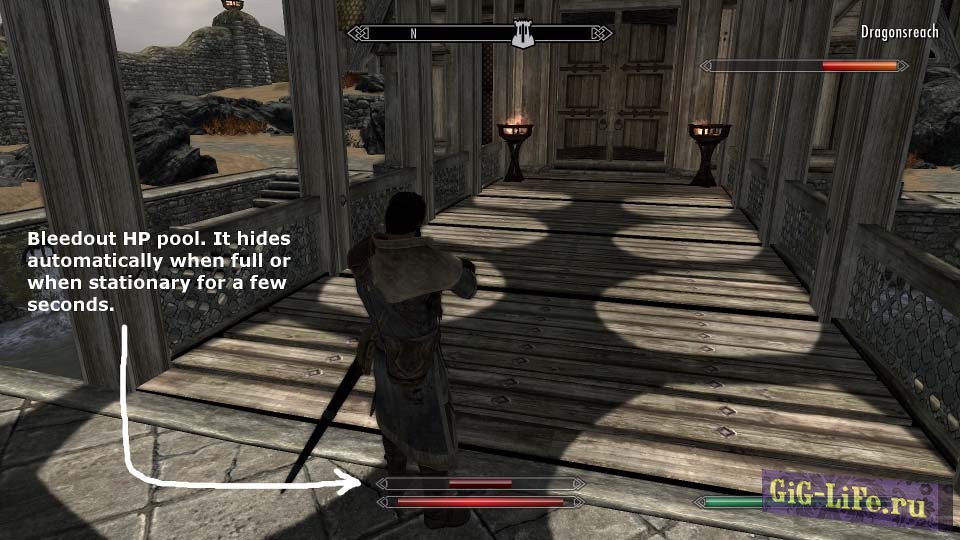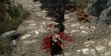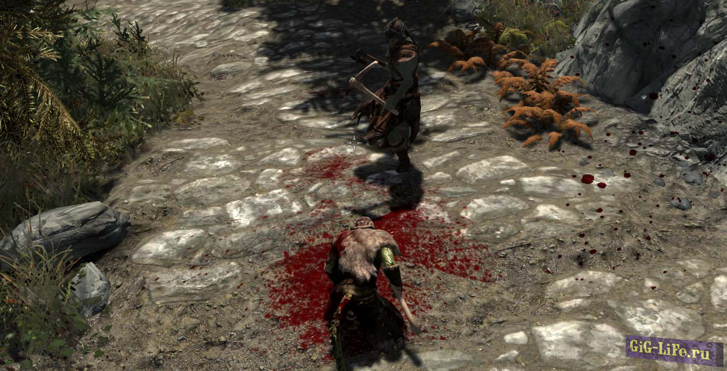 Как это делается? Во-первых, персонажу игрока добавлено «состояние кровотечения» (подобное тому, что существует у бессмертных NPC). Как только количество вашего здоровья достигает нуля, вы входите в режим кровотечения. В этом состоянии вы лежите на земле, будучи неспособным совершать прямые действия, но вы всё ещё не потерпите поражение, пока количество «очков кровотечения» не исчерпается.