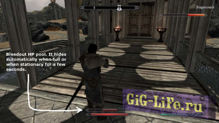 Состояние кровотечения для персонажа игрока (ПИ) делает невозможной смерть с одного удара (one-shot) могучих врагов. Количество очков кровотечения у ПИ равно его нормальному количеству очков здоровья. Количество очков кровотечения уменьшается в режиме кровотечения, и естественное восстановление здоровья занимает много времени. Пока оно восстанавливается, на ПИ воздействует антибонус кровотечения (Bleeding debuff), который немного уменьшает нормальную регенерацию здоровья. Полоска виджета показывает оставшееся количество очков кровотечения (сразу над нормальной полоской здоровья). iHUD будет скрывать эту полоску, когда вы не в бою (такое же ограничение, как и в виджете мода Frostfall.