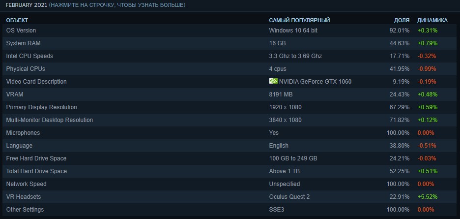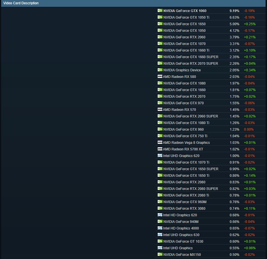 Результаты нисколько не удивляют: наиболее популярной видеокартой остается GeForce GTX 1060 (9.19%), следом идут GTX 1050 Ti (6.63%) и GTX 1650 (5.00%). Самая «народная» карта от AMD находится лишь на 11-м месте. Это Radeon RX 580 (2.03%).
