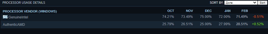 Если говорить о процессорах, то доля AMD снова выросла по сравнению с Intel. Сейчас решениями «красной» команды пользуется 28.51% игроков на Windows.
