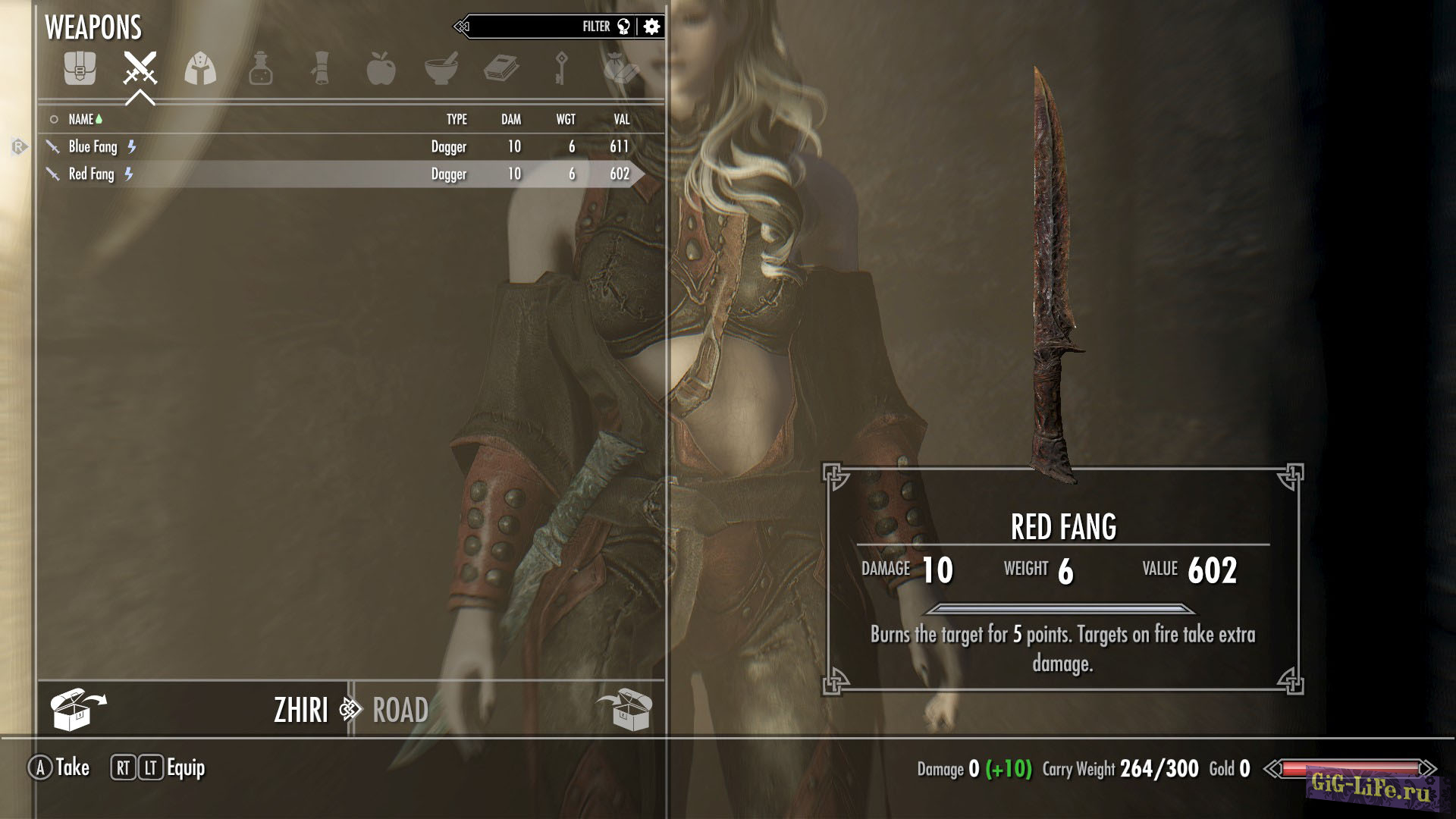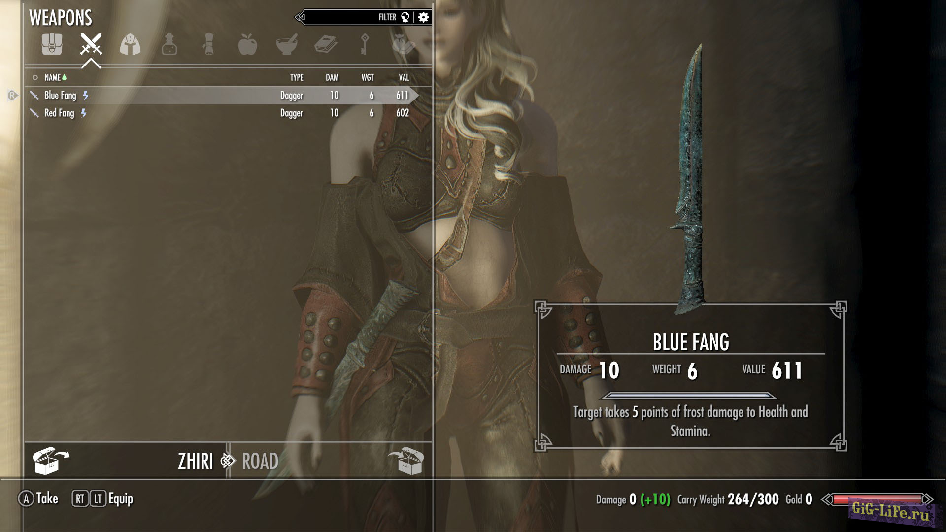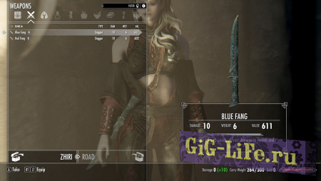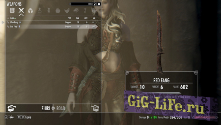 Оружие: Красный клык (с огненным зачарованием), Синий клык (с морозным зачарованием)