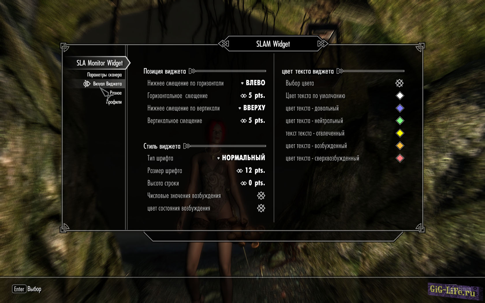 SexLab Aroused Monitor Widget показывает возбуждение вашего персонажа и 7 ближайших NPC. Виджет отображает имена НПС и указывает их возбуждение через числовое значение, или цвет сигнала.