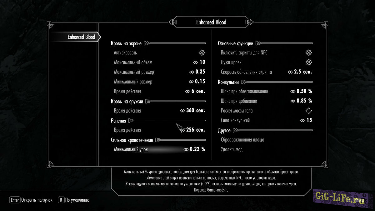 - Конфликтует с другими реплейсерами крови и модами на изменение урона