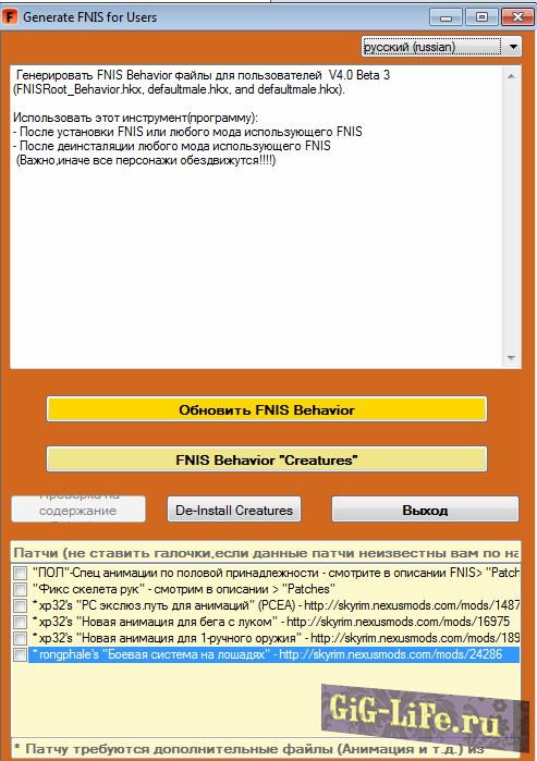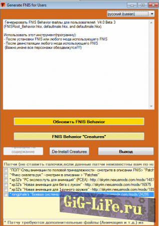 - Внизу окошка FNIS есть патчи для разных модов, если у вас таковые установлены, то отметьте галочками (по умолчанию все патчи отключены).