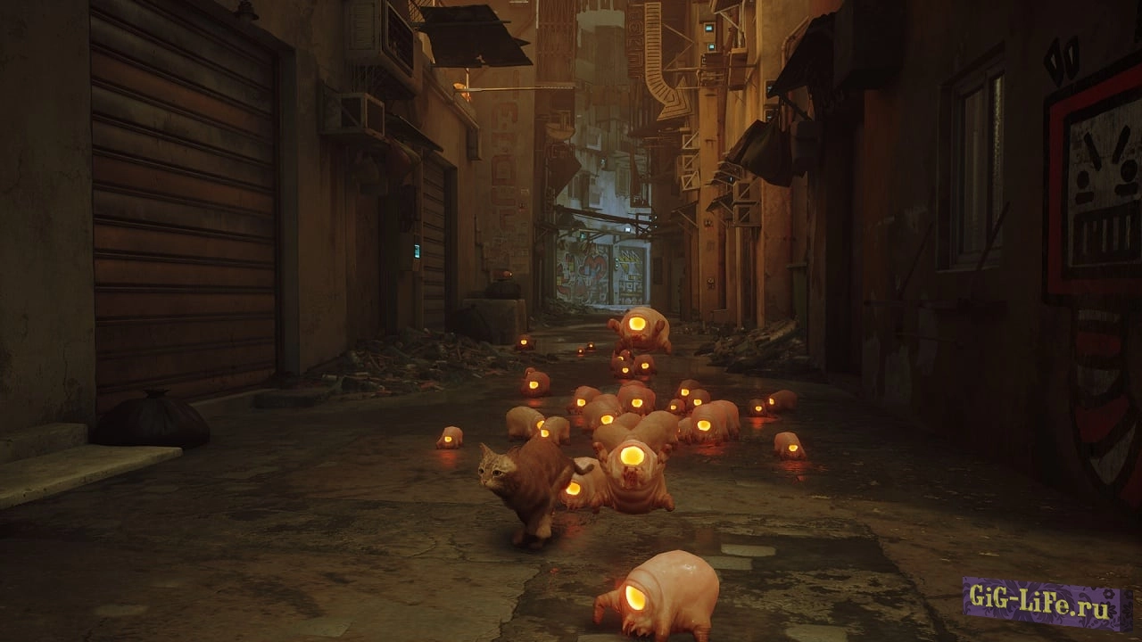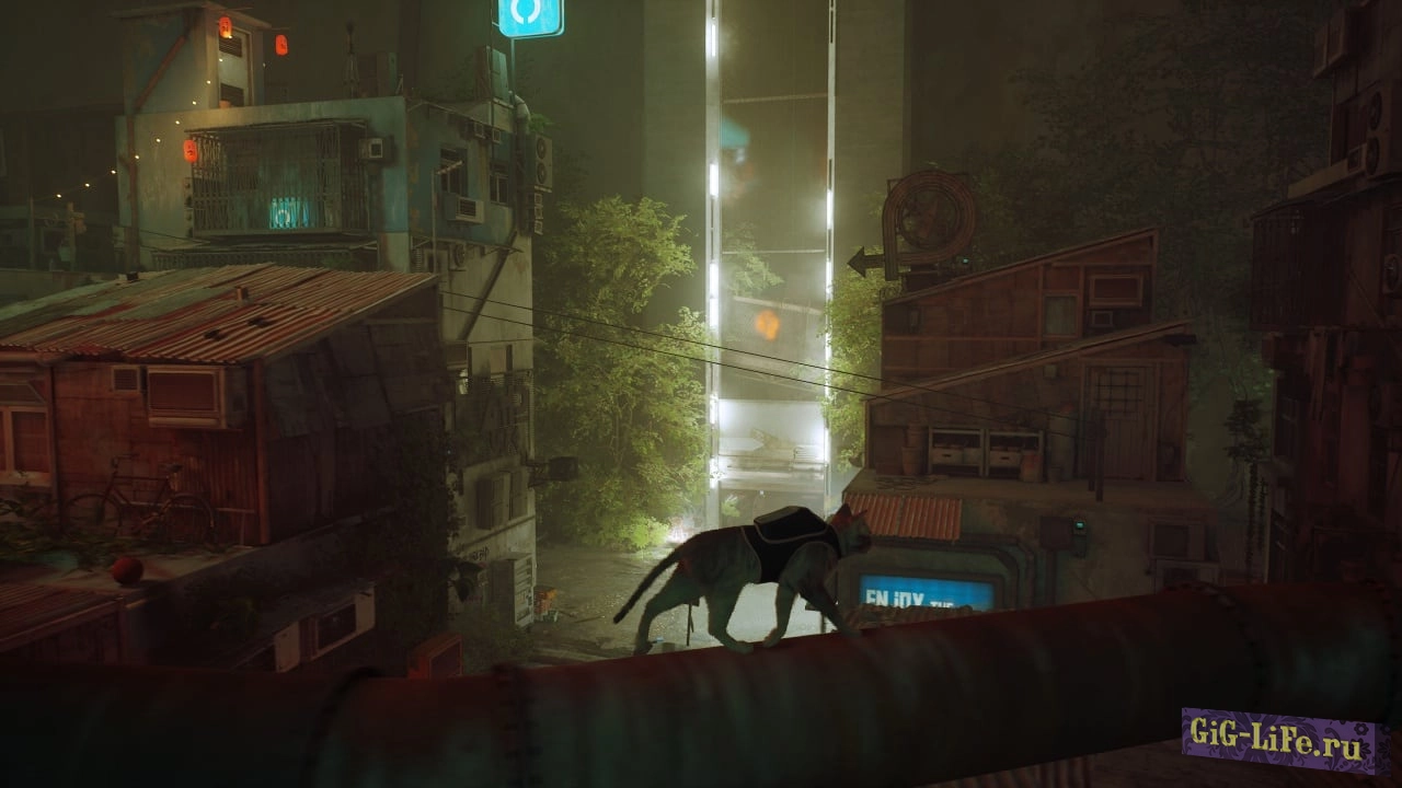 Персонаж побывает в таких местах, куда проблематично добраться человеку. Прячьтесь под машинами, проникайте в подвалы, гуляйте по заборам и грациозно балансируйте на карнизах. Путешествуйте по улицам, которые завалены мусором и освещены неоновыми вывесками. Если взобраться повыше, откроется отличный вид на действия роботов, суетящихся внизу.