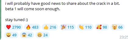 Вероятно, в ближайшее время я смогу поделиться с вами хорошими новостями касательно кряка. Первая бета выйдет совсем скоро. Следите за обновлениями.