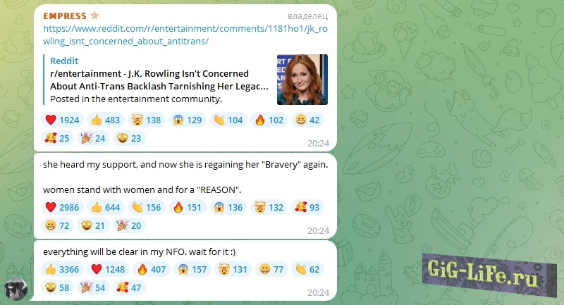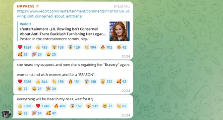 Сообщество EMPRESS забанили на Reddit за пиратство и резкие высказывания в адрес трансгендеров: хакерша выразила полную поддержку Джоан Роулинг, сообщив, что женщины должны держаться вместе, а также заявила, что не боится цензуры, так как она Русская и поэтому полностью под защитой. Правда ли это или очередная эксцентричная выходка для привлечения внимания - неизвестно.