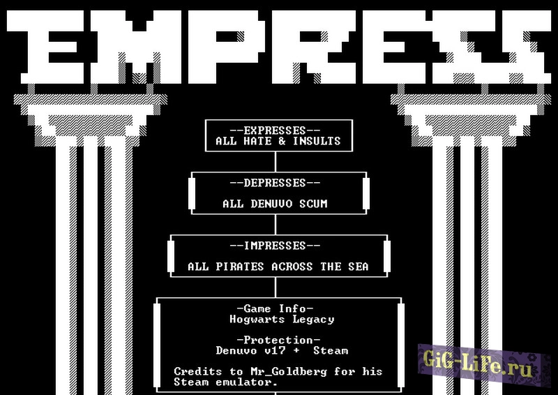 Девушка-хакер EMPRESS сообщила в своем Телеграм-канале об успешном взломе action/RPG Hogwarts Legacy. Стабильную версию кряка уже можно скачать на торрентах. Игра вышла в продажу 10 февраля и была взломана всего за 9 дней, не считая бета-тестов. Взломана предрелизная версия игры, так как, по словам EMPRESS, патч первого дня ухудшил производительность. Hogwarts Legacy была защищена условной 17-ой версией Denuvo.