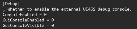 - Если вы хотите отключить отображение консоли UE4SS во время игры, просто отредактируйте UE4SS-settings.ini: