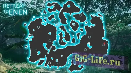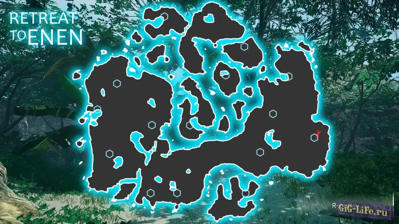 Основная локация в Retreat To Enen представляет собой большой остров, разделенный на несколько биомов. Тропические леса, заснеженные горные вершины, песчаные поля и другие места отличаются не только по внешнему виду, но и по условиям проживания. У персонажа нет ничего кроме универсальных часов с картой местности и компаса, который также помогает ориентироваться.