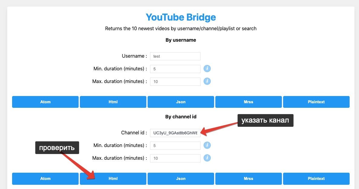 Так как я хочу получить rss поток всех роликов с канала, то использую именно 15-символьный идентификатор канала.