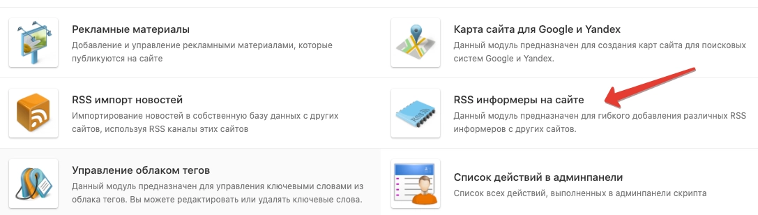 Далее самый простой способ это интеграция со штатным модулем движка RSS информеры на сайте